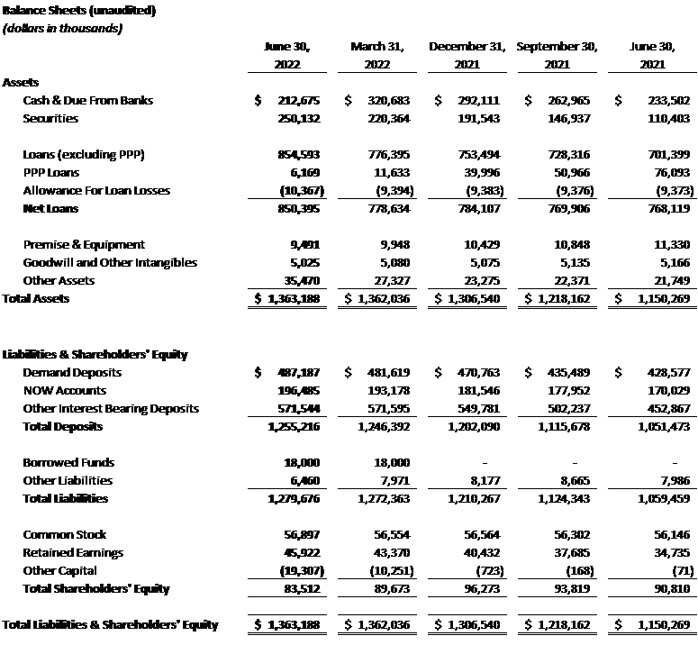 The Bank has generated substantial loan growth, deploying liquidity into “core loans” which exclude SBA PPP loans. Core loans have grown 22% or $153.2 million over the last year since June 30, 2021, 13% or $101.1 million year to date since December 31, 2021, and 10% or $78.2 million in the last quarter since March 31, 2022. PPP loan forgiveness has been efficiently handled for our small business clients, and only $6.2 million of these 1.00% interest rate loans remained outstanding at June 30, 2022. The $0.9 million addition to allowance for loan and lease loss in 2022 was necessary based on the core loan growth reported above. The Bank maintained strong credit quality with no other real estate owned, no loans 90 days or more past due, and only $3.5 million or 0.41% of total loans excluding PPP on non-accrual status, which are well supported by collateral and reserves.