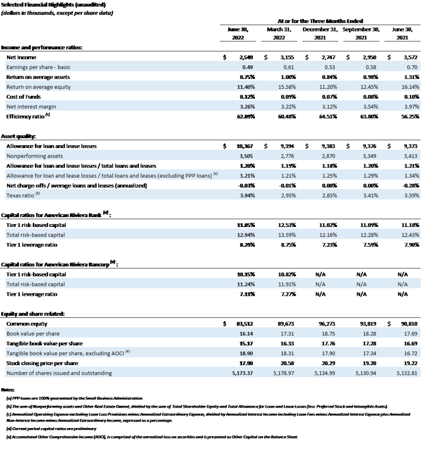 Santa Barbara, California (July 21, 2022) – American Riviera Bancorp (“Company”) (OTCQX: ARBV), holding company of American Riviera Bank (“Bank”), announced today unaudited net income of $5.7 million ($1.10 per share) for the six months ended June 30, 2022 compared to the $6.1 million ($1.19 per share) earned in the same reporting period in the previous year. Unaudited net income was $2.5 million ($0.49 per share) for the three months ended June 30, 2022 compared to the $3.6 million ($0.70 per share) earned in the same reporting period in the previous year. The decline in year to date net income in 2022 compared to 2021 is primarily attributable to higher amounts of non-recurring SBA PPP loan fee income in 2021. PPP fee income recognized was $1.2 million lower in the six months ending June 30, 2022 than recognized in the same reporting period in the previous year.