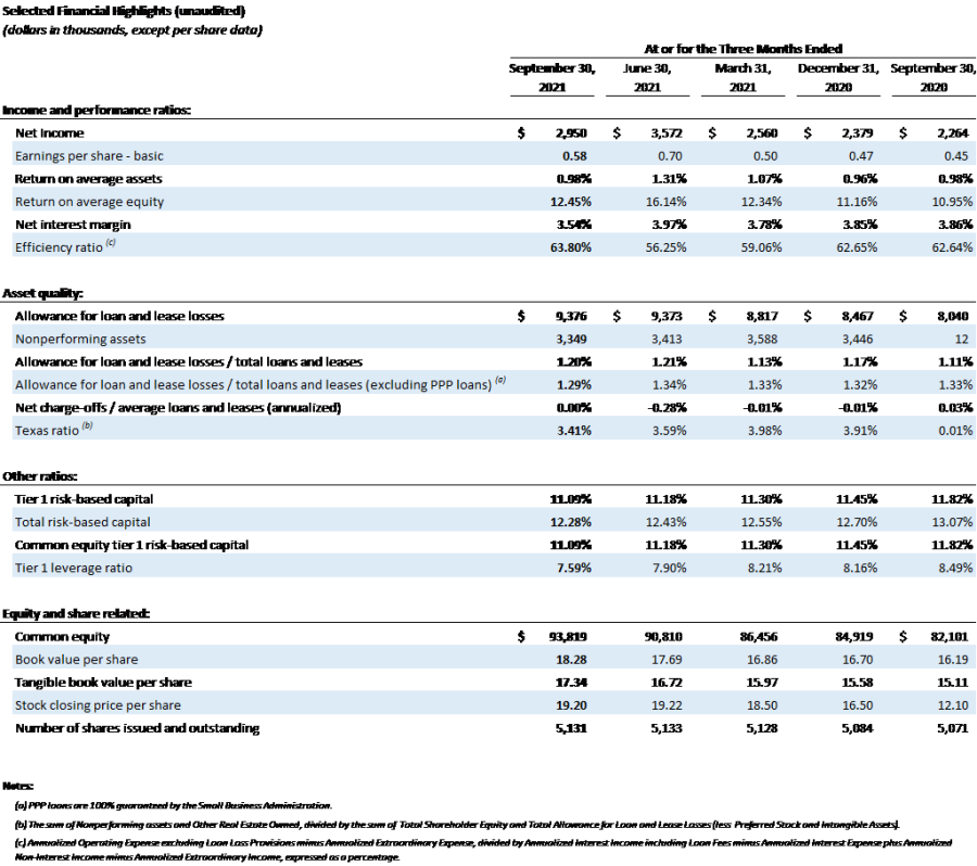 In 2021, the Bank has achieved an annualized return on average assets of 1.12% and return on average equity of 13.64%. Unaudited net income was $2,950,000 ($0.58 per share) for the third quarter ended September 30, 2021, compared to the $2,264,000 ($0.45 per share) earned in the same reporting period in the prior year.